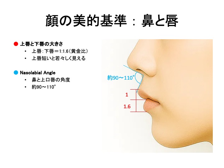美容外科では、上唇と下唇の黄金比、**鼻と唇の角度(鼻唇角)**を指標に、